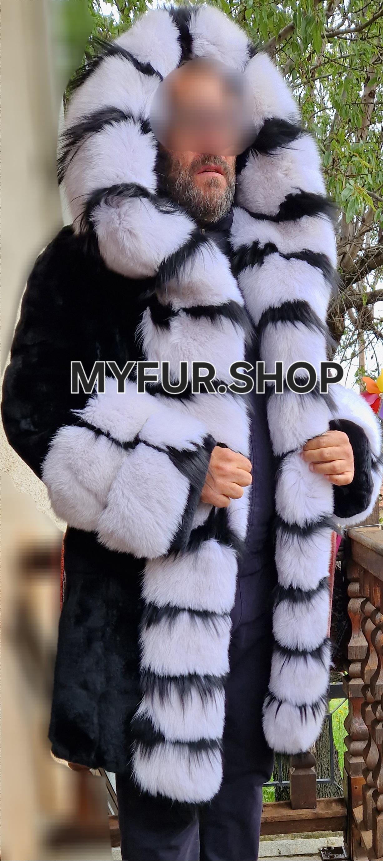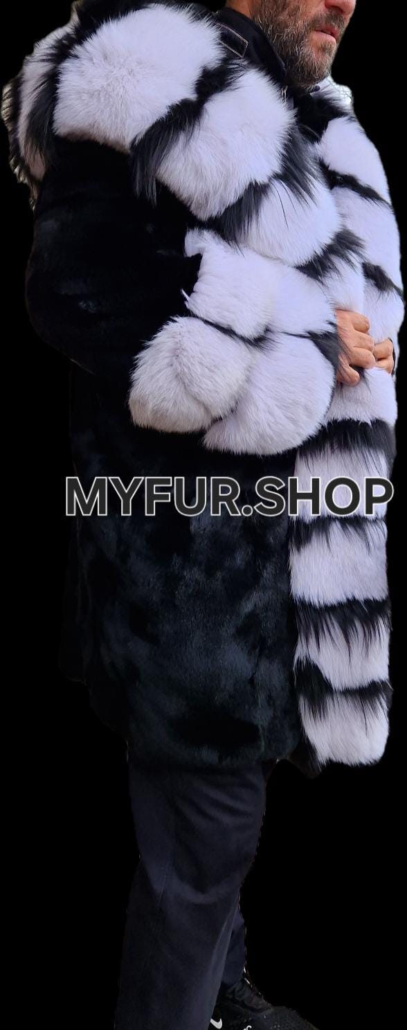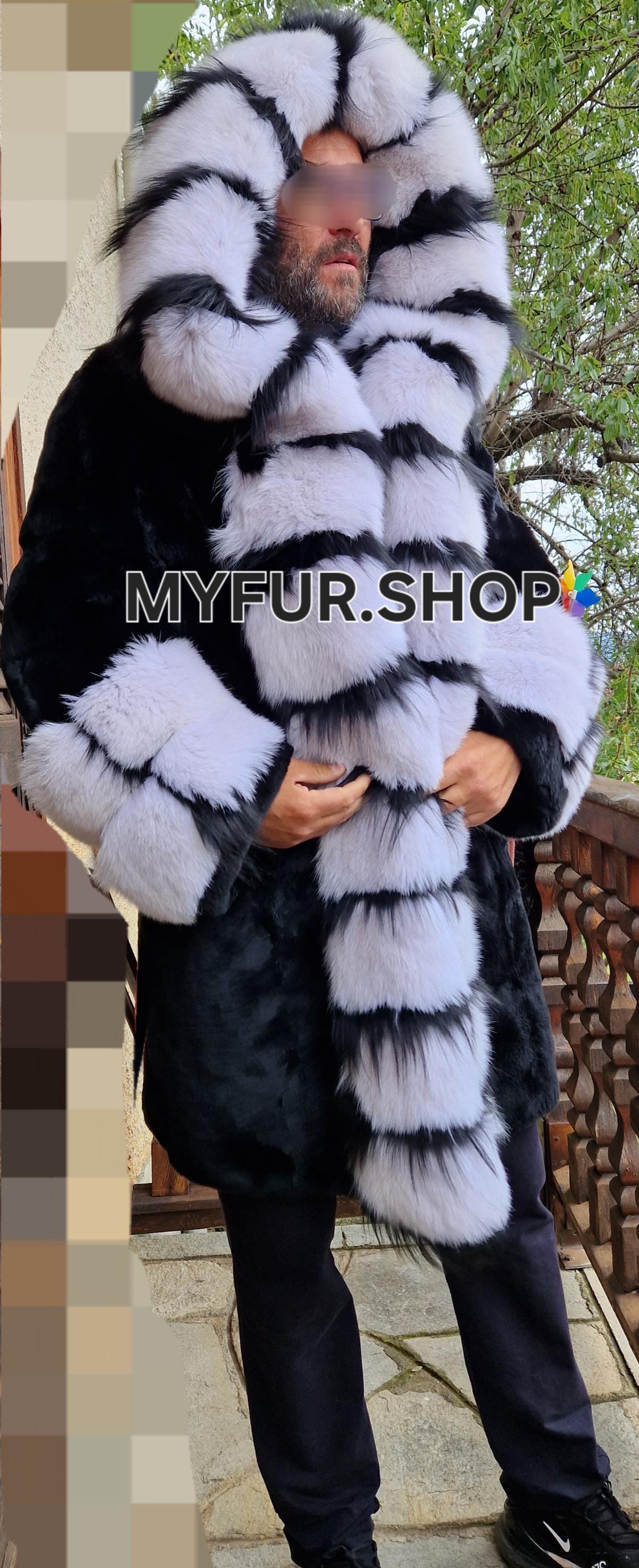Natural Real Men's Hooded Fur Coat from Fullpelts Rex and full Foxes around the hood and all the front part of the coat!