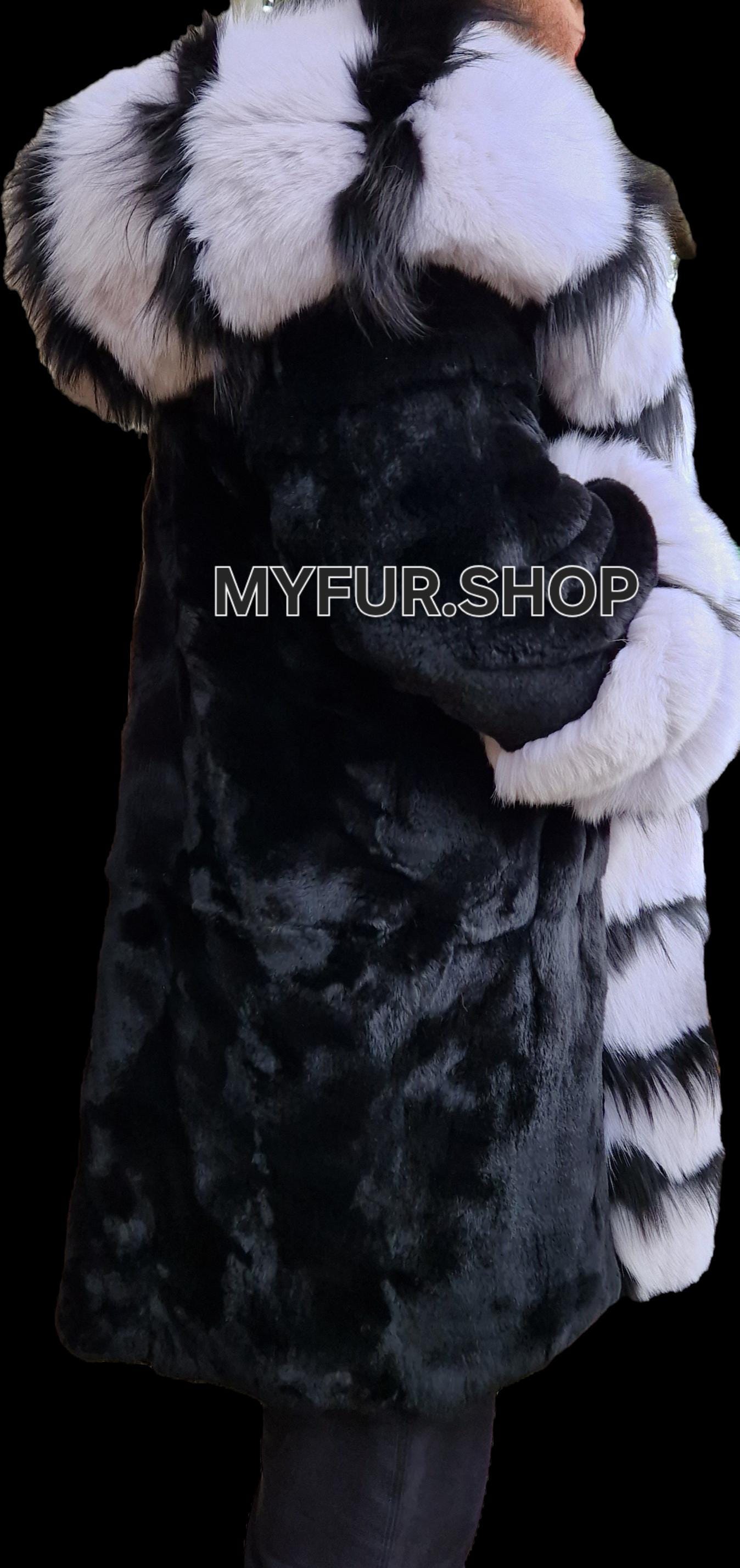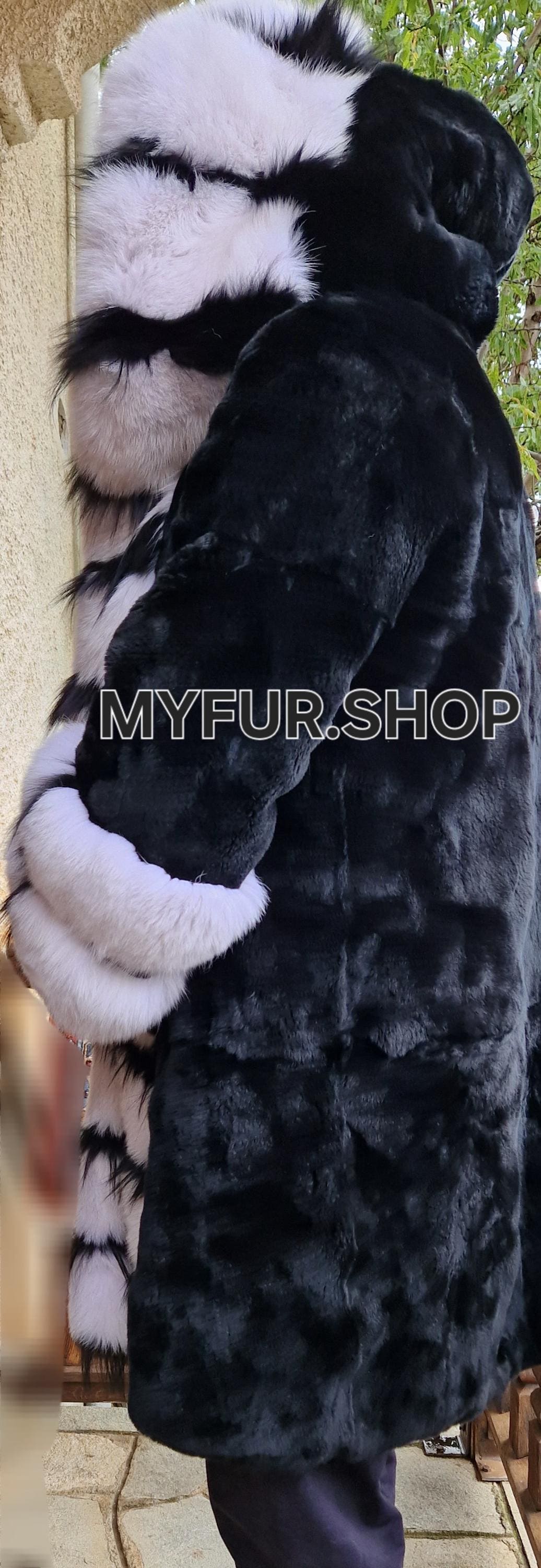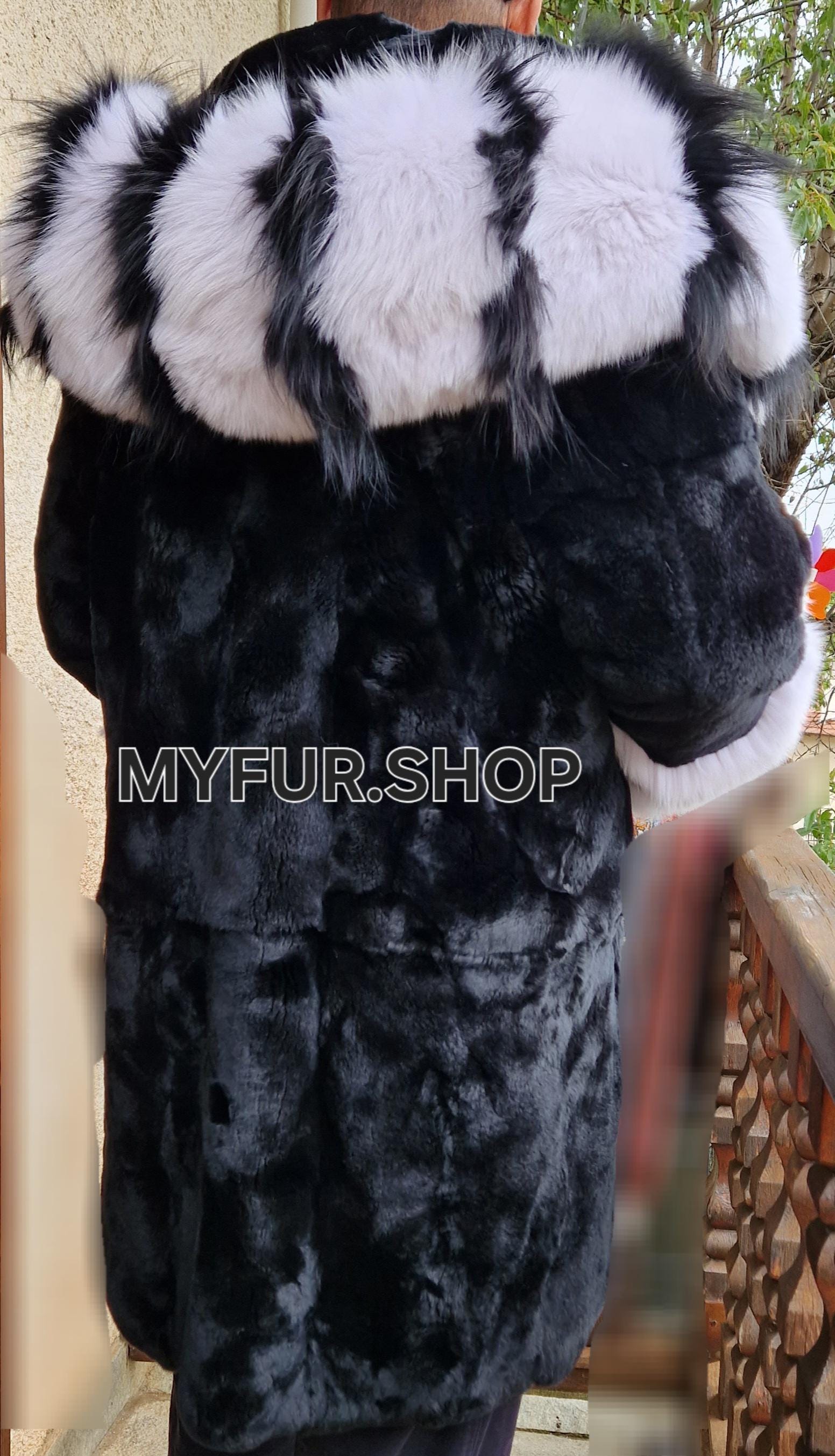 Natural Real Men's Hooded Fur Coat from Fullpelts Rex and full Foxes around the hood and all the front part of the coat!