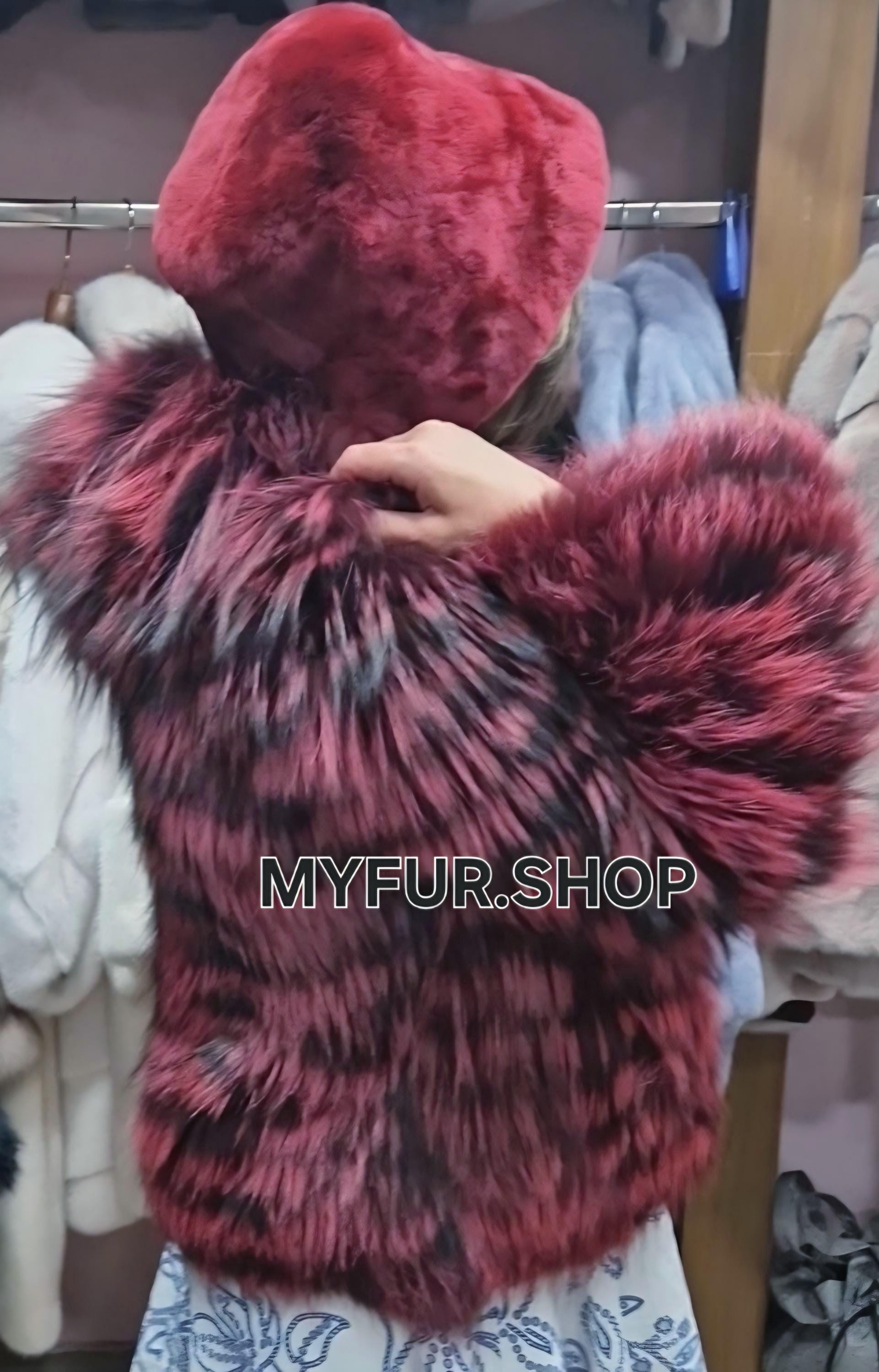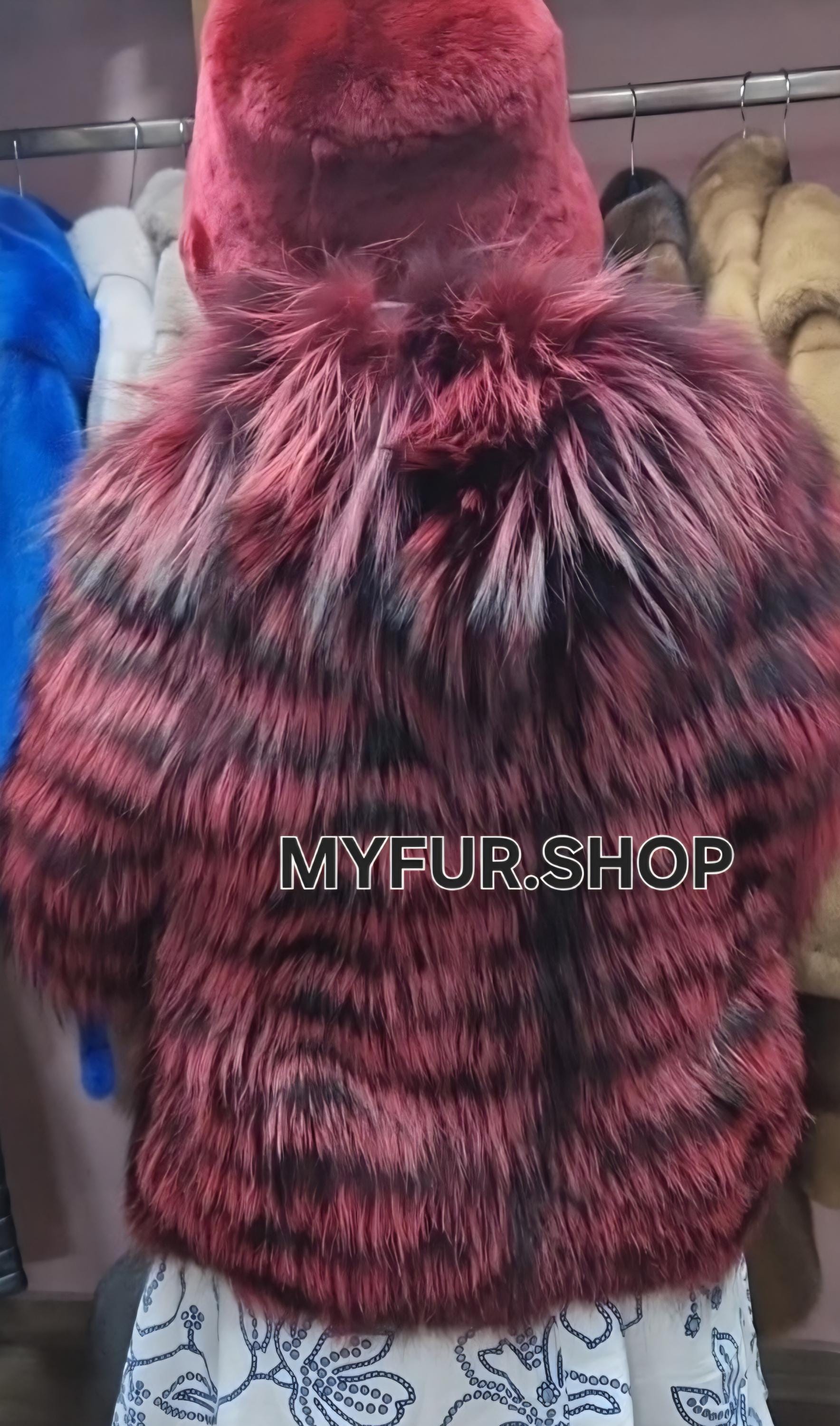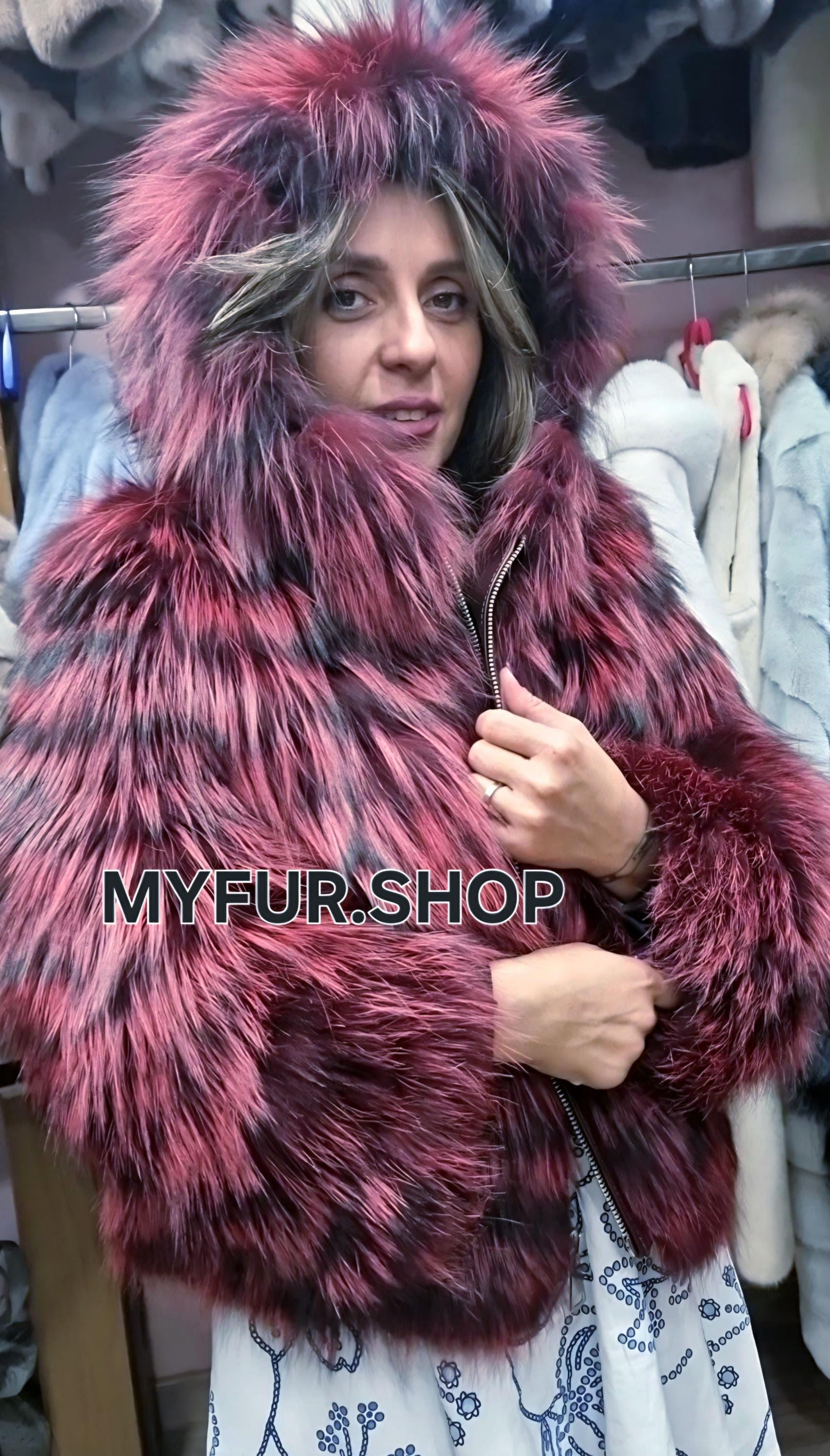 NEW,Real and Natural Modern Fluffy Hooded fur jacket from beautiful bright Burgundy color Fox!