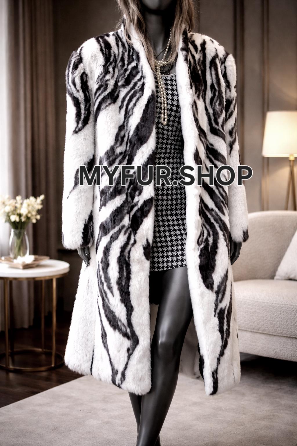 NEW,Real and Natural WHITE fullpelts slightly sheared Rabbit fur coat with Beautiful Black Pattern!